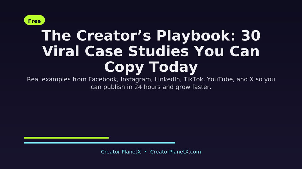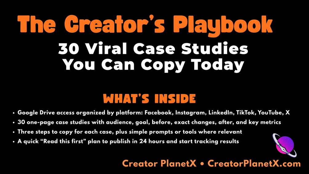 The Creator’s Playbook gives you 30 real case studies from six platforms. Each one shows the goal, the exact changes, and the result. You’ll see what to post, how often to post, and how to turn attention into buyers. The steps are simple enough to execute in a day.