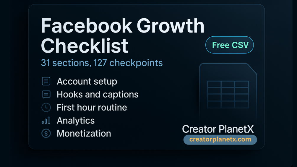A step by step Facebook growth system for creators. 31 sections and 127 checkpoints covering setup, hooks, cadence, engagement, analytics, and monetization. (FREE)